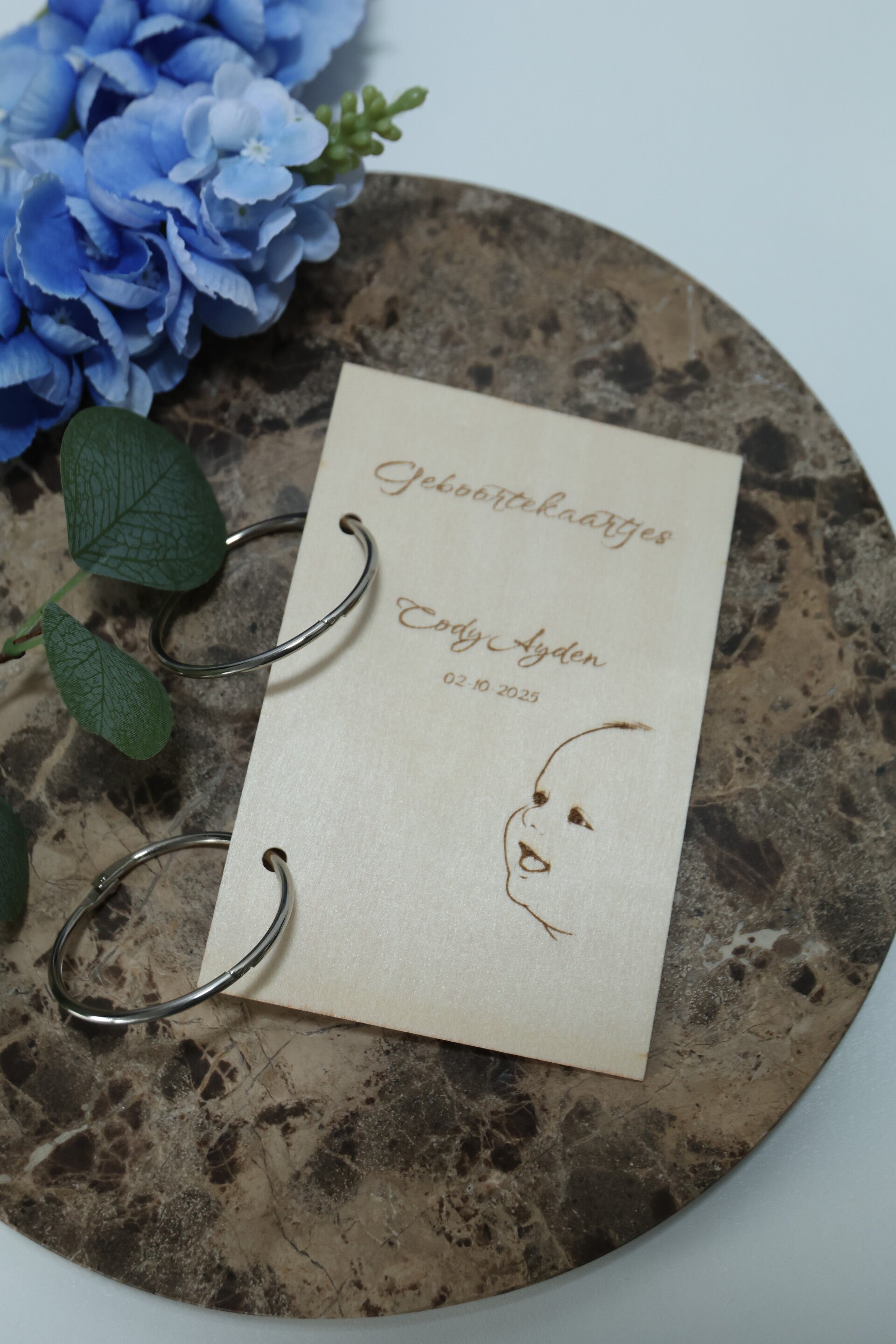 - Geboortebundel met [babynaam + geboortedatum] en persoonlijke lijntekening